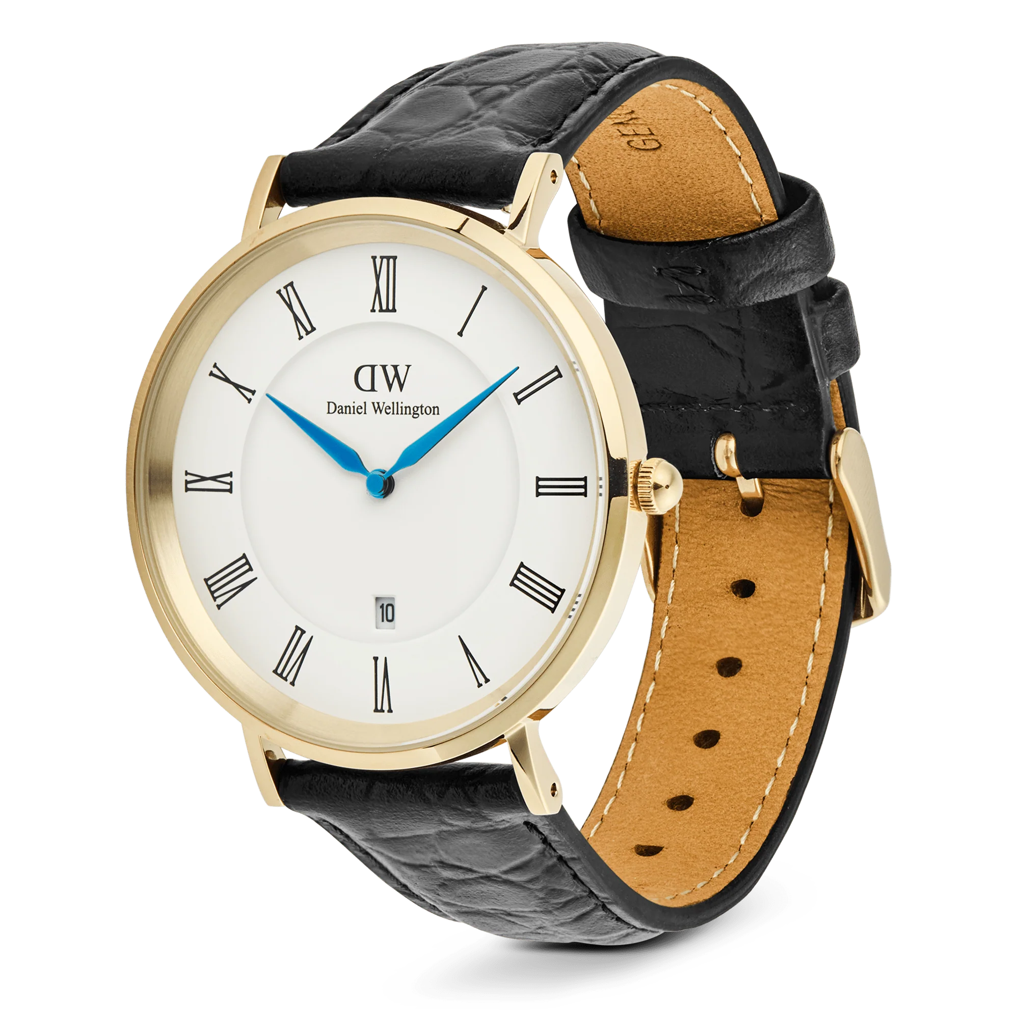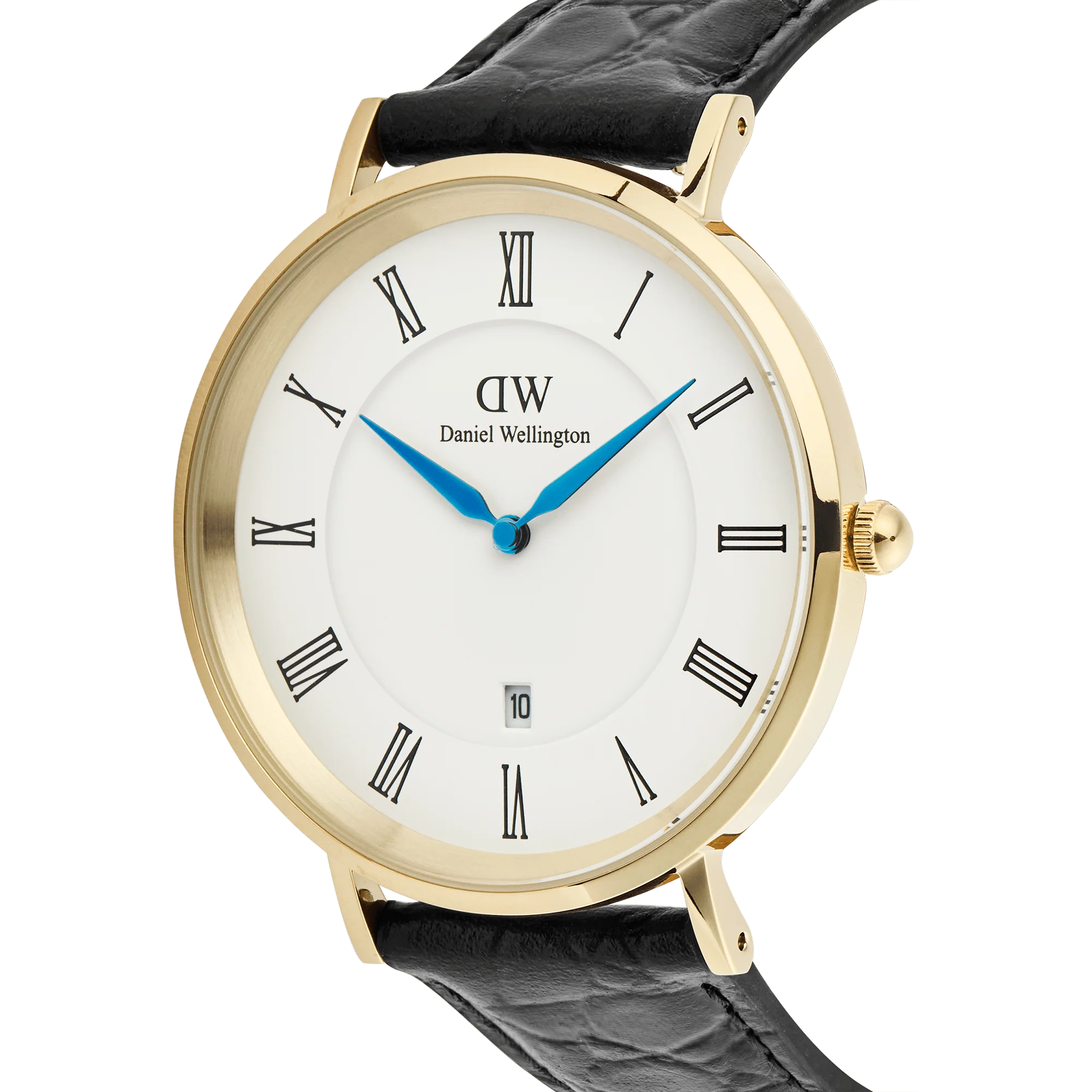 Description: Classic Roman Numerals Date Black Croc Belly Gold is our refined take on a gold roman numeral watch. A polished gold-tone 316L steel case frames a matte white dial with crisp Roman numeral hour markers, vibrant blue hands, and a discreet 6 o’clock date. The round silhouette and balanced layout create a gold watch with white face that feels timeless and clear. We pair it with a gently padded black Croc Belly leather strap that tapers for comfort and elegance. The chunkier scales lend a refined vintage character, making this piece at home with a suit or a knit. If you enjoy white dial watches and round gold watches with subtle presence, this design meets the moment for both casual and formal wear. It is a gold steel watch that brings quiet confidence to everyday style.